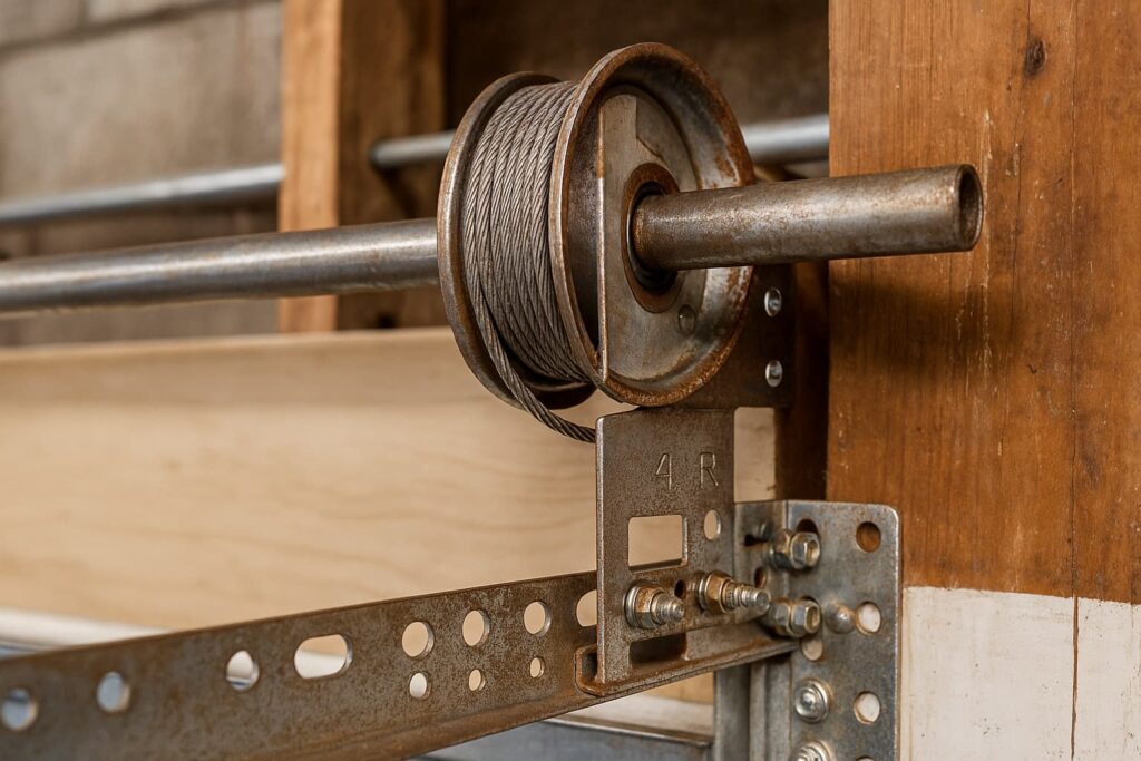 - Visible Cracks, Worn Grooves, or Bent Drum Edges – Inspect the drum at the top of your door. Cracks, bent edges, or worn grooves reduce cable grip and can cause uneven operation or sudden door failure.